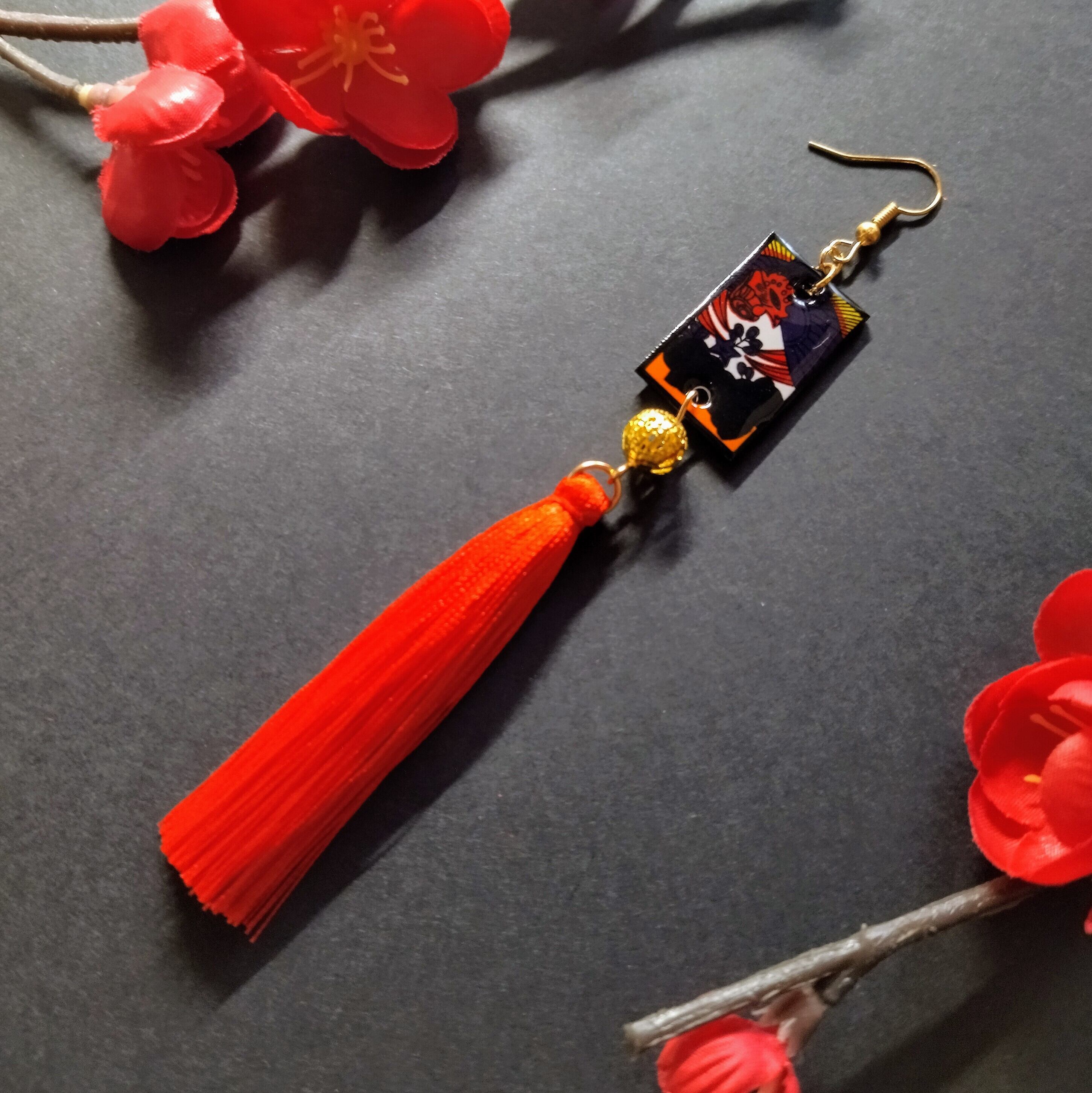 プラバンで作った花札をレジンで裏表コーティングしてピアスにしました。こちらは片耳のみの販売となっております。タッセルと組み合わせて存在感抜群です。和風、花札モチーフがお好きな方にいかがでしょうか?