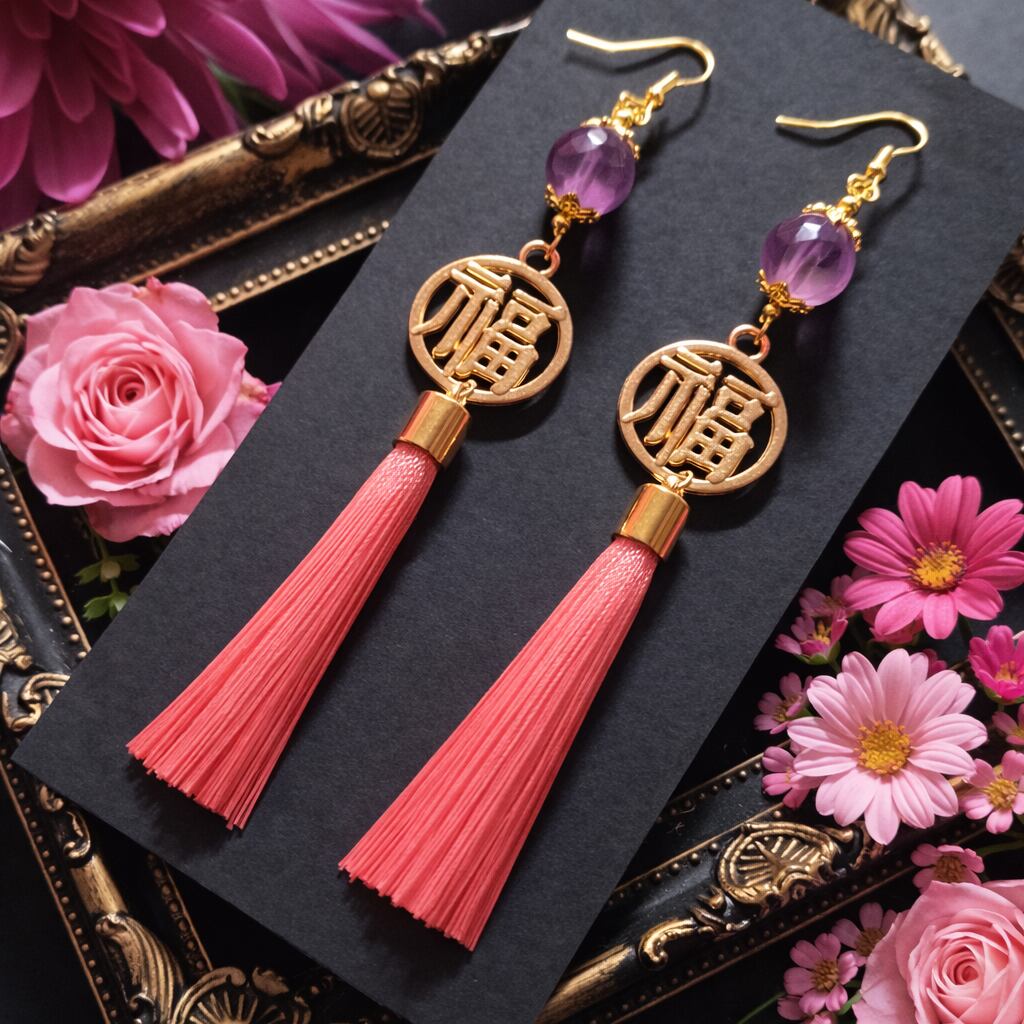 タッセル チャイナ 中華風 チャイナドレス 赤 青 ピンク 黄色 緑 紫 白 黒 水色 推し活 推し色 プレゼント ギフト ハロウィン イヤリング 華ロリ 中華風コーデ チャイナコーデ 漢字 幸福 福 和風 和装 着物 浴衣 袴 和装コーデ 着物コーデ アレルギー対応