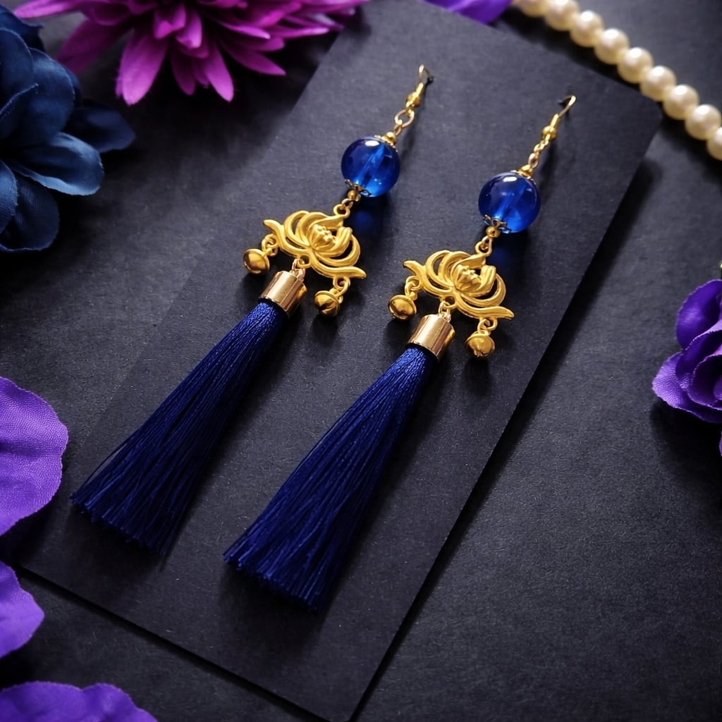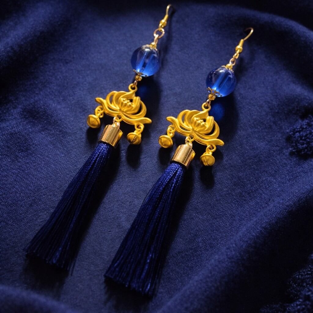 【和風】蓮の花とタッセルのピアス(紺)(イヤリング)【中華風】【チャイナ】【着物】【浴衣】【袴】【推し活】【推し色】【チャイナ】【中華風】