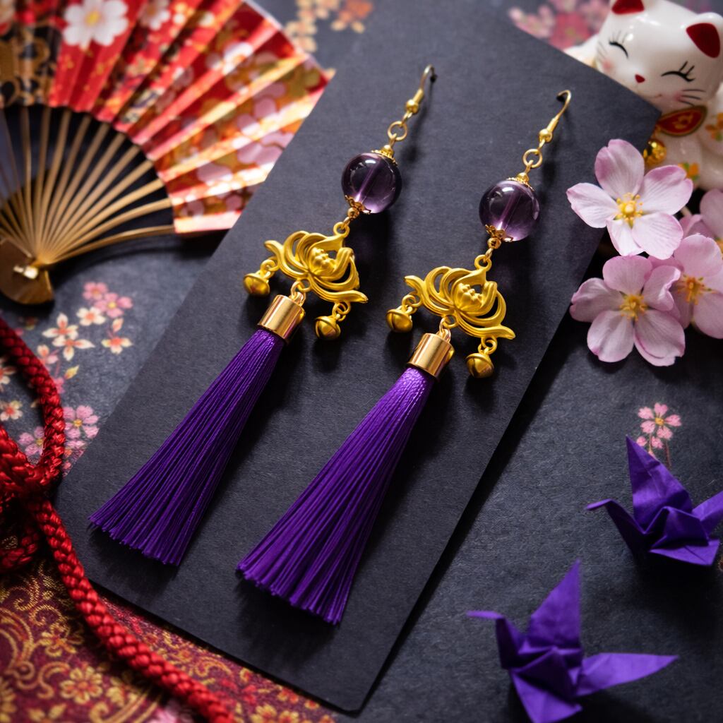 【和風】蓮の花とタッセルのピアス(紫)(イヤリング)【中華風】【チャイナ】【着物】【浴衣】【袴】【推し活】【推し色】【チャイナ】【中華風】