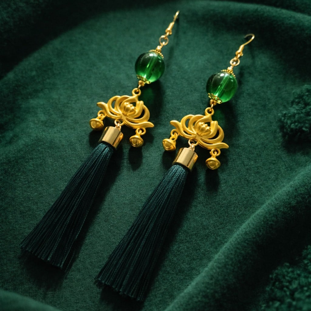 【和風】蓮の花とタッセルのピアス(深緑)(イヤリング)【中華風】【チャイナ】【着物】【浴衣】【袴】【推し活】【推し色】【チャイナ】【中華風】