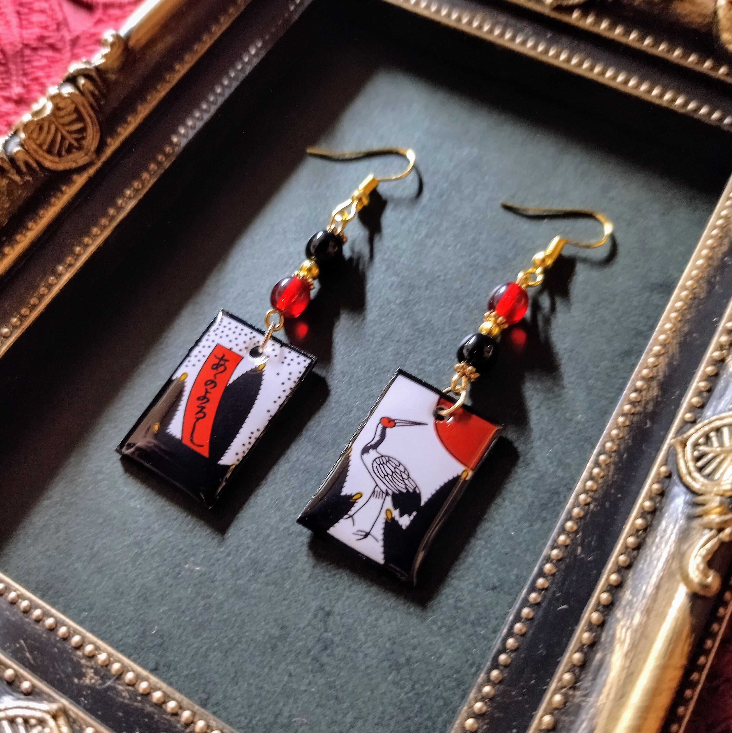プラバンで作った花札をレジンで裏表コーティングしてピアスにしました。赤いチェコビーズとオニキスを左右非対称につけてあります。和風、花札モチーフがお好きな方にいかがでしょうか?