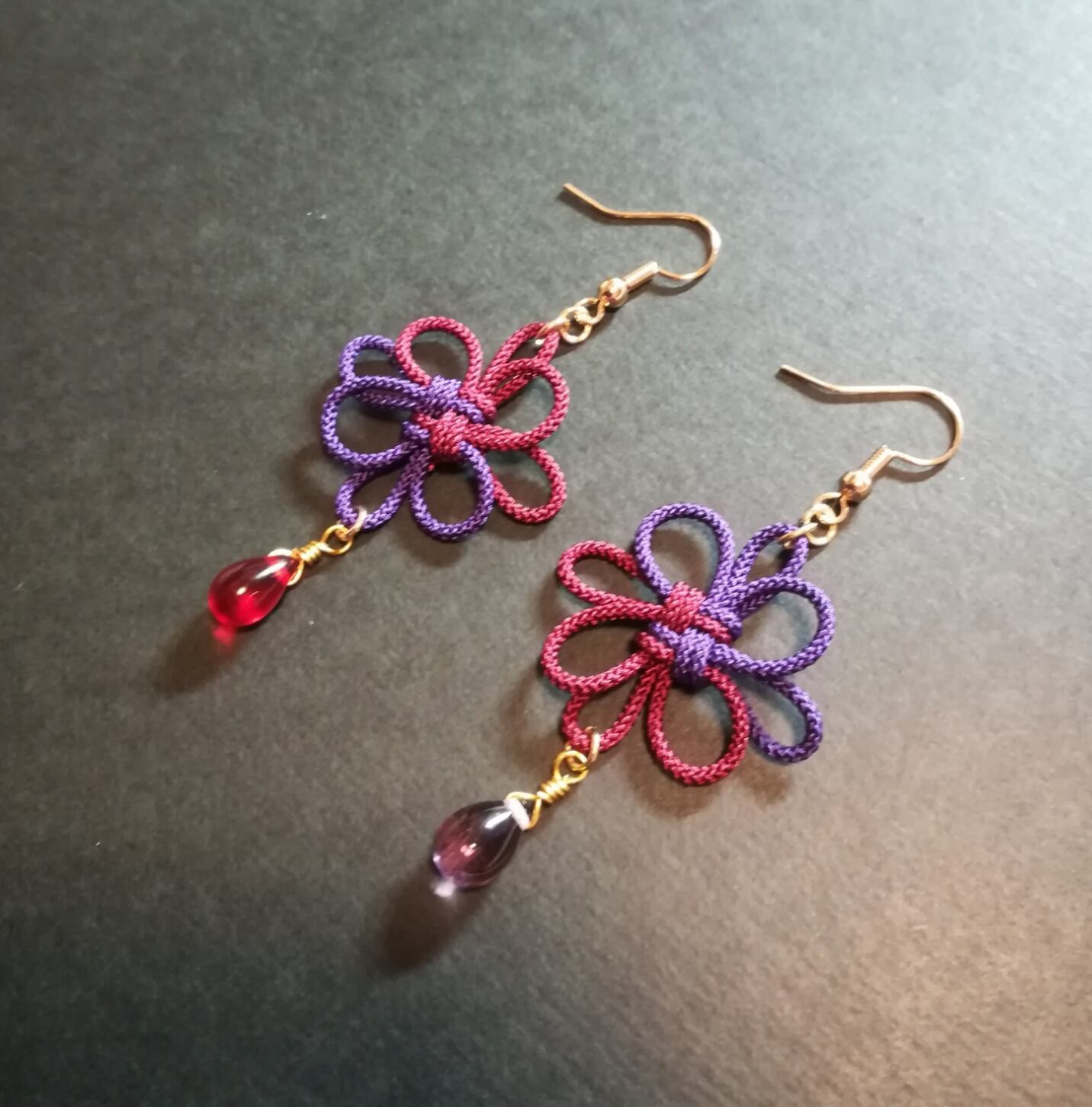 【和風】【和ゴス】飾り結びとチェコビーズのピアス(えんじ×紫)【チャイナ】【中華風】【飾り結び】【アジアンノット】【チャイナドレス】