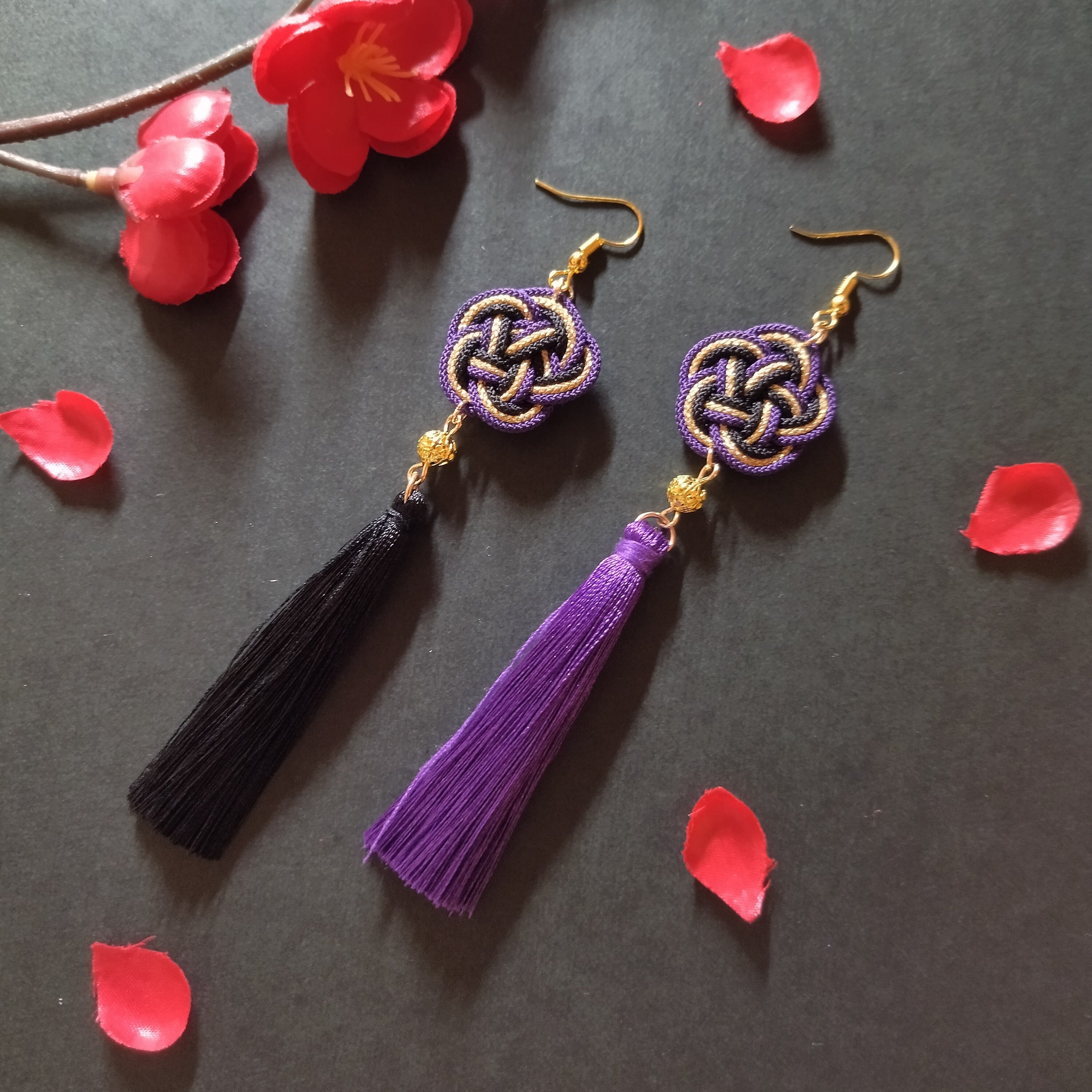 アジアンコード(1mm)で作った梅結びとタッセルを組み合わせたピアスです。