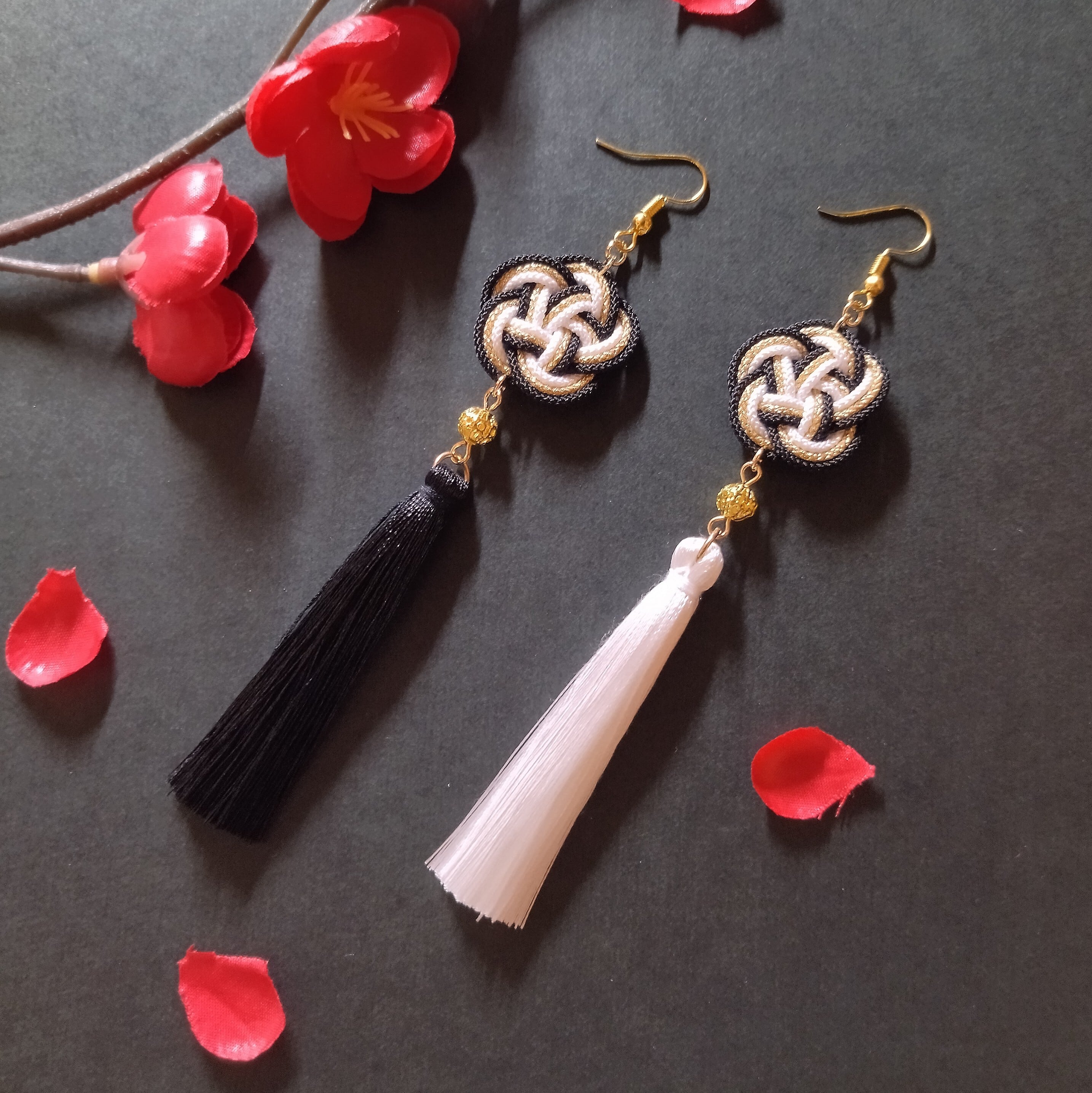 アジアンコード(1mm)で作った梅結びとタッセルを組み合わせたピアスです。