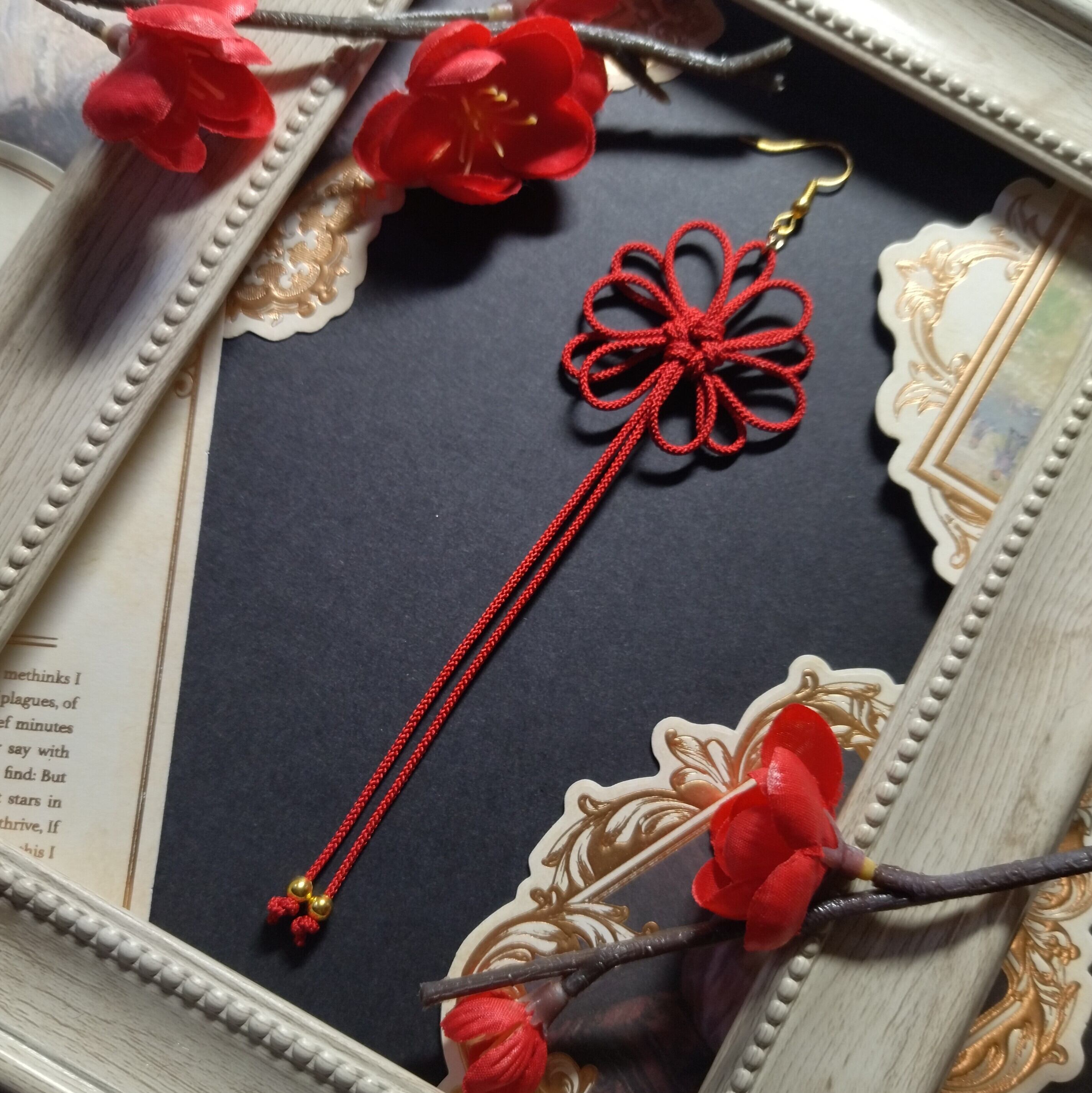 アジアンコード(1mm)で作った片耳ピアスです。八重菊結びという少し凝った結び方になります。