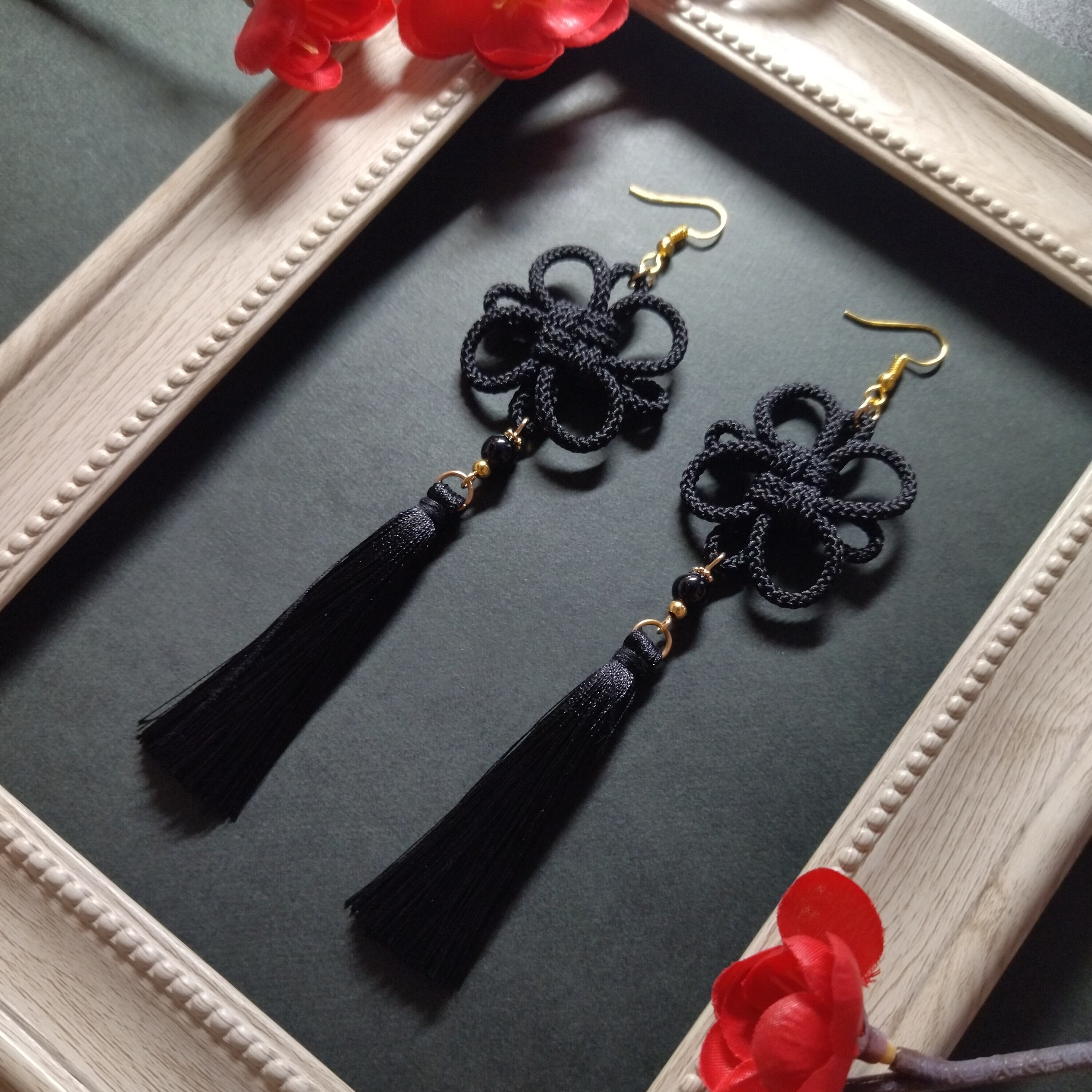 【太】吉祥結びとタッセルのピアス(イヤリング)(黒)【和ゴス】【チャイナ】【中華風】【成人式】【卒業式】【袴】【着物】