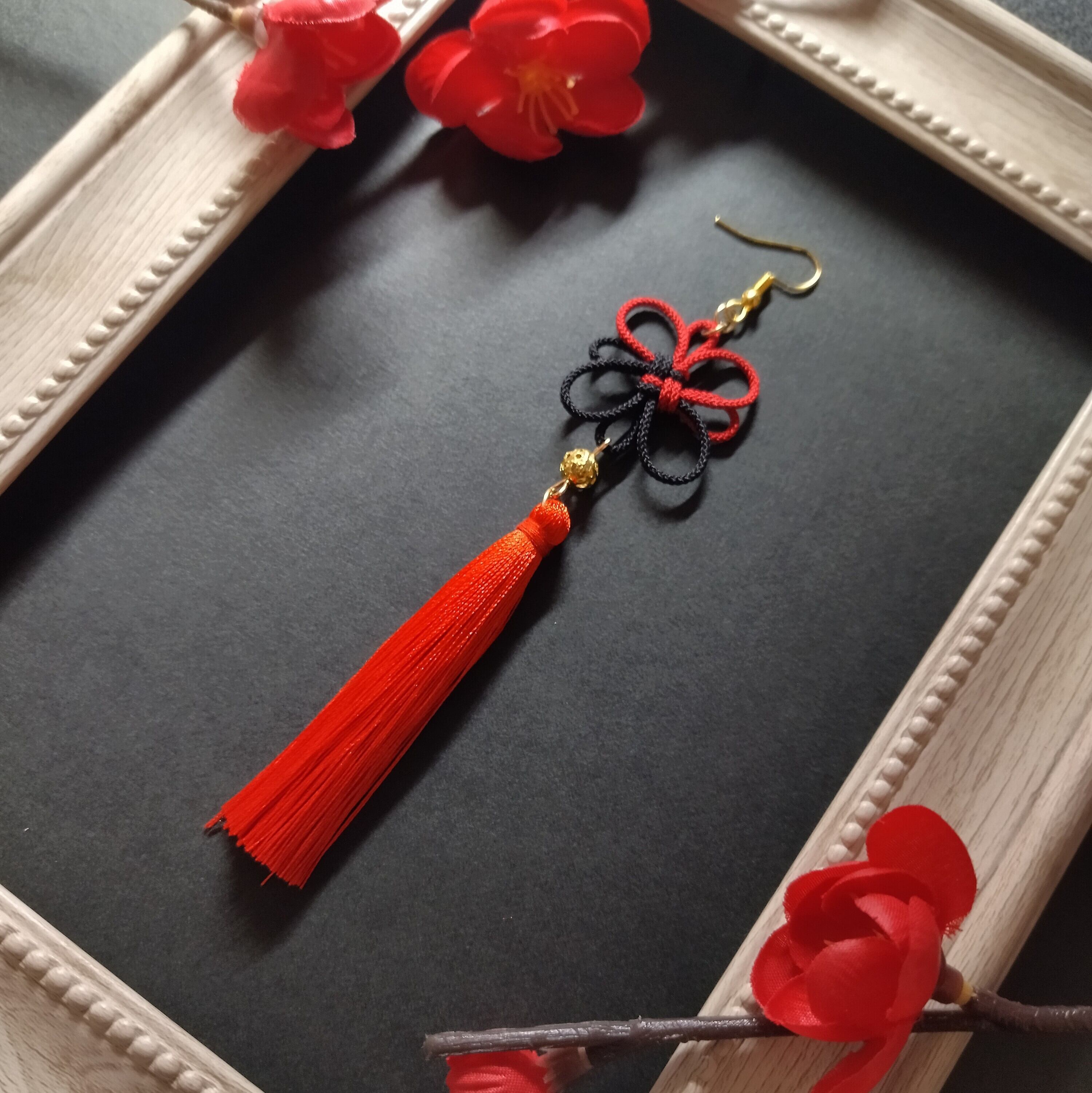 アジアンコード(1mm)で作った吉祥結びとタッセルを組み合わせたピアスです。結びとタッセルの間に挟んだゴールドの透かしがキラキラとして、存在感がありつつもとても可愛いです。着物、チャイナドレス、コスプレ等にいかがでしょうか?(^_^)