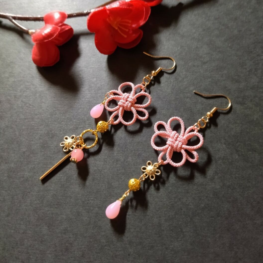 【和風】飾り結びとお花のピアス(イヤリング)(薄ピンク)【チャイナ】【中華風】【成人式】【着物】【浴衣】