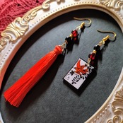 プラバンで作った花札をレジンで裏表コーティングしてピアスにしました。赤いチェコビーズとオニキスを左右非対称につけてあります。片耳が花札、片耳がタッセルのアシンメトリー仕様です。和風、花札モチーフがお好きな方にいかがでしょうか?