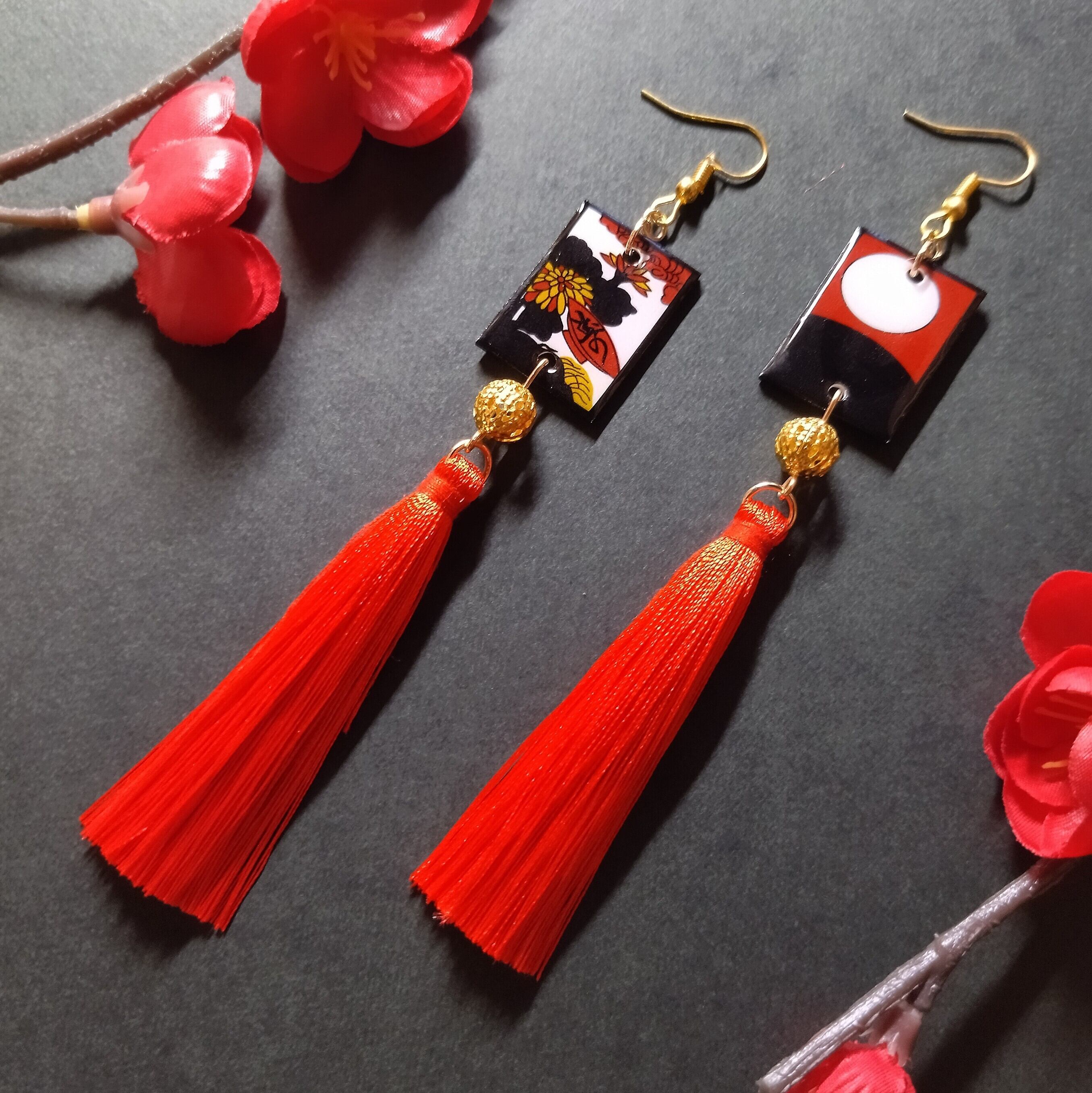 プラバンで作った花札をレジンで裏表コーティングしてピアスにしました。タッセルと組み合わせて存在感抜群です。和風、花札モチーフがお好きな方にいかがでしょうか?