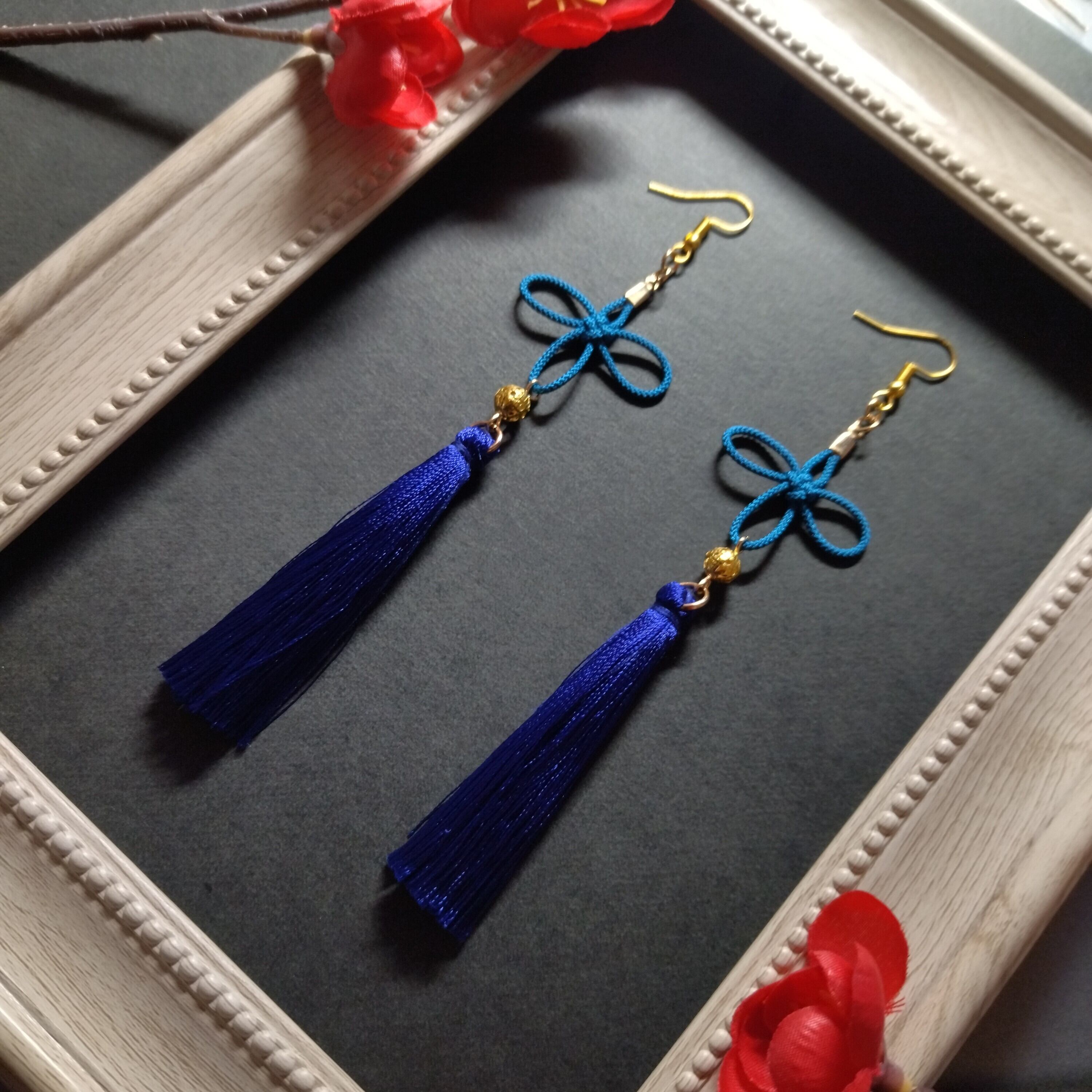 【和風】【ゴールドビーズ】几帳結びとタッセルのピアス(イヤリング)(青)【チャイナ】【和ロリ】【和ゴス】【アジアンノット】