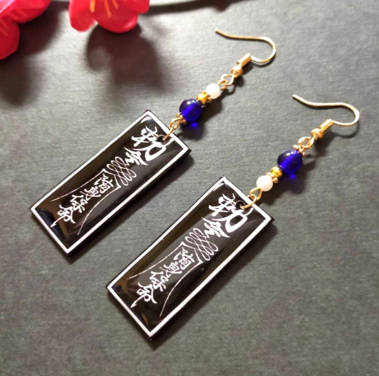 【チャイナ】キョンシーの御札モチーフピアス(イヤリング)(黒青)【中華風アクセサリー】【華ロリ】【キョンシー】