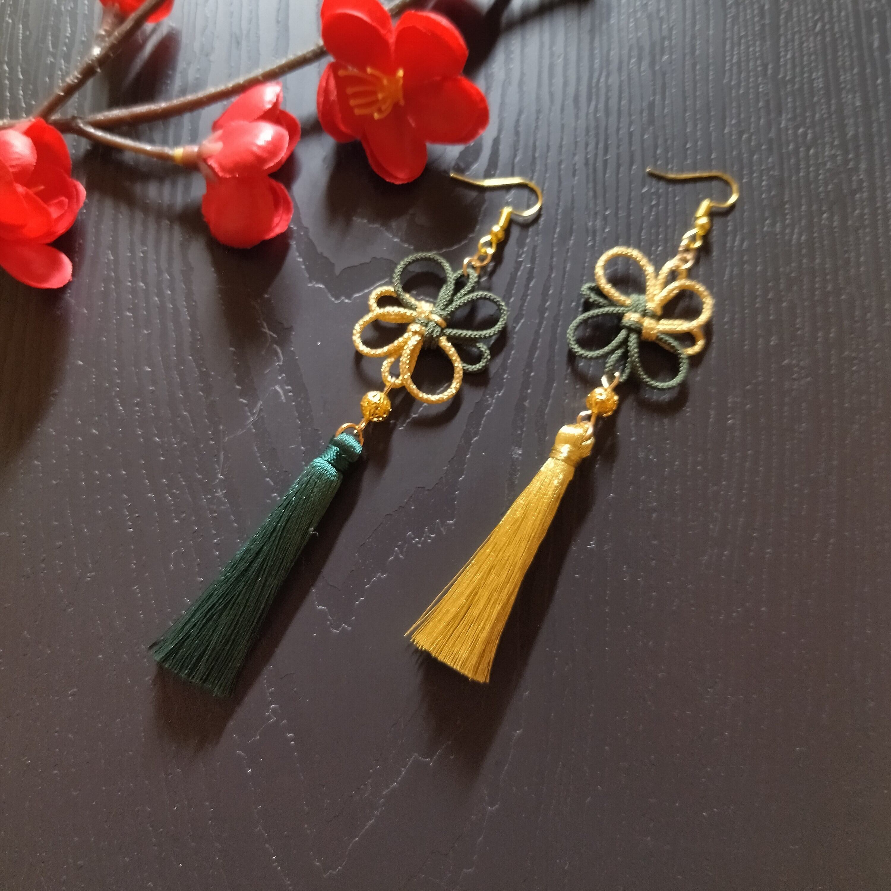 【バイカラー】【和風】吉祥結びとタッセルのピアス(イヤリング)(深緑×ゴールド)【成人式】【飾り結び】【着物】【浴衣】【袴】【中華風】【チャイナ】