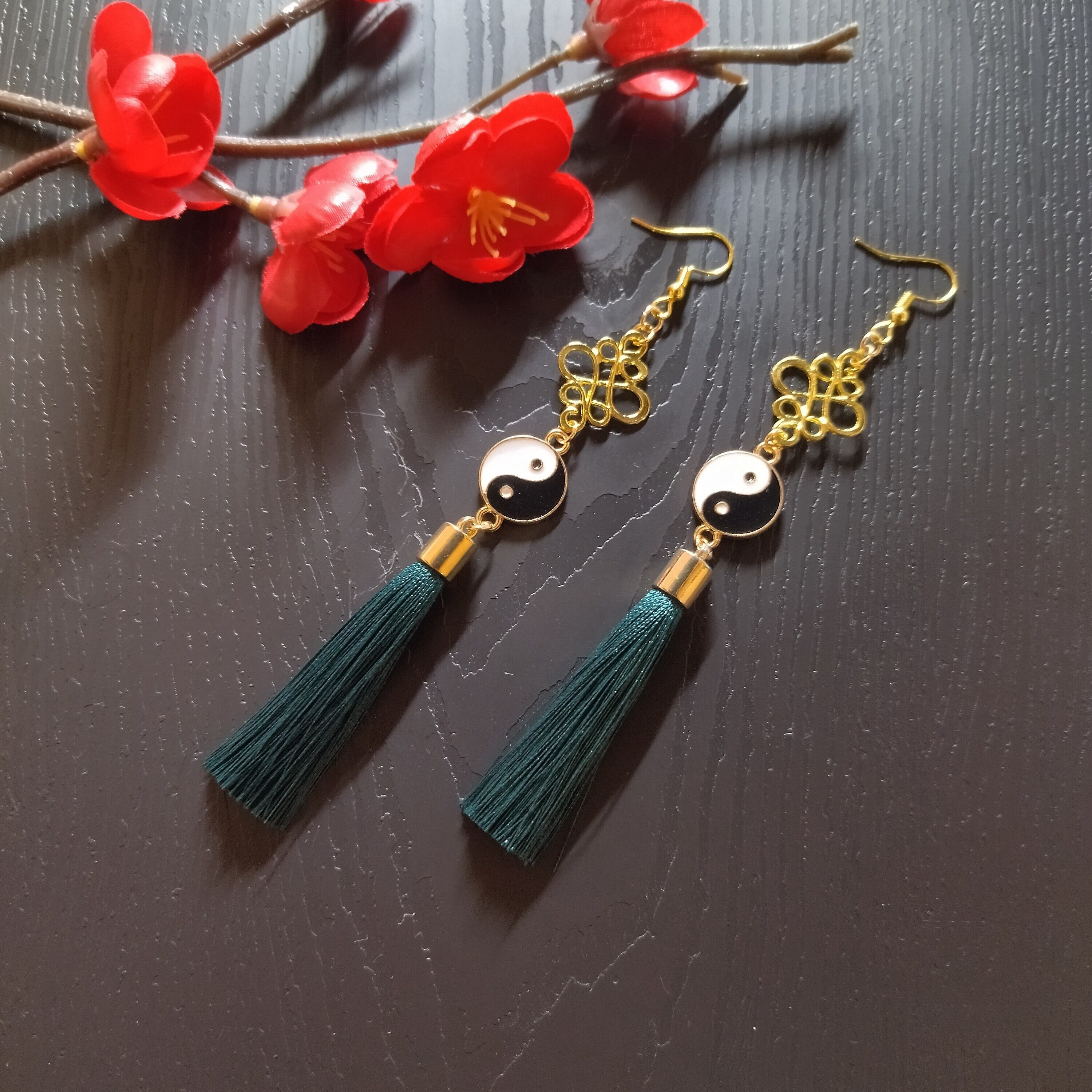 【和風】陰陽玉とタッセルのピアス(イヤリング)(深緑)【中華風】【チャイナ】【アジアン】【インヤン】【陰陽】