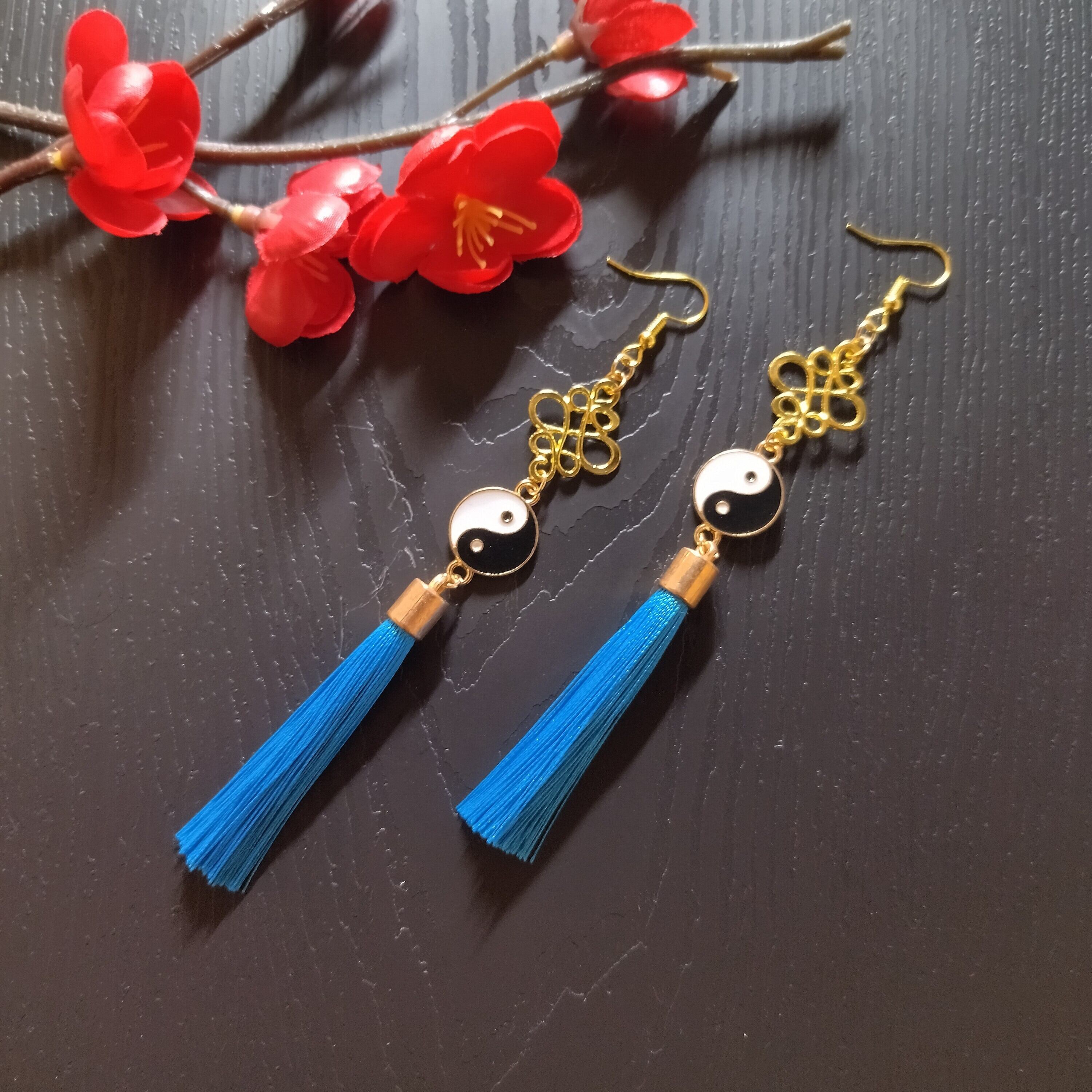 コピー【和風】陰陽玉とタッセルのピアス(イヤリング)(水色)【中華風】【チャイナ】【アジアン】【インヤン】【陰陽】