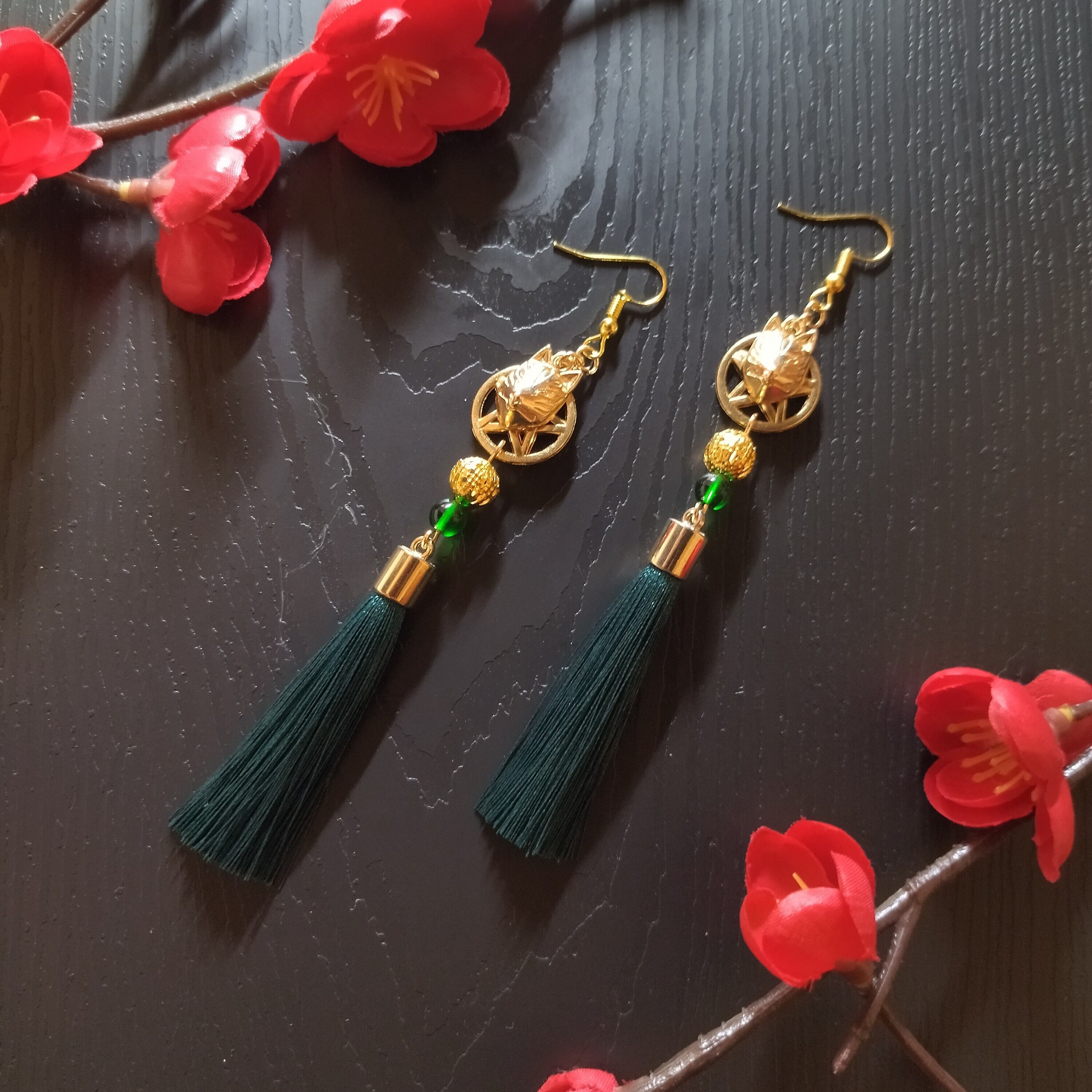 【和風】狐面とタッセルのピアス(深緑)(イヤリング)【チャイナ】【着物】【浴衣】【アジアン】【袴】