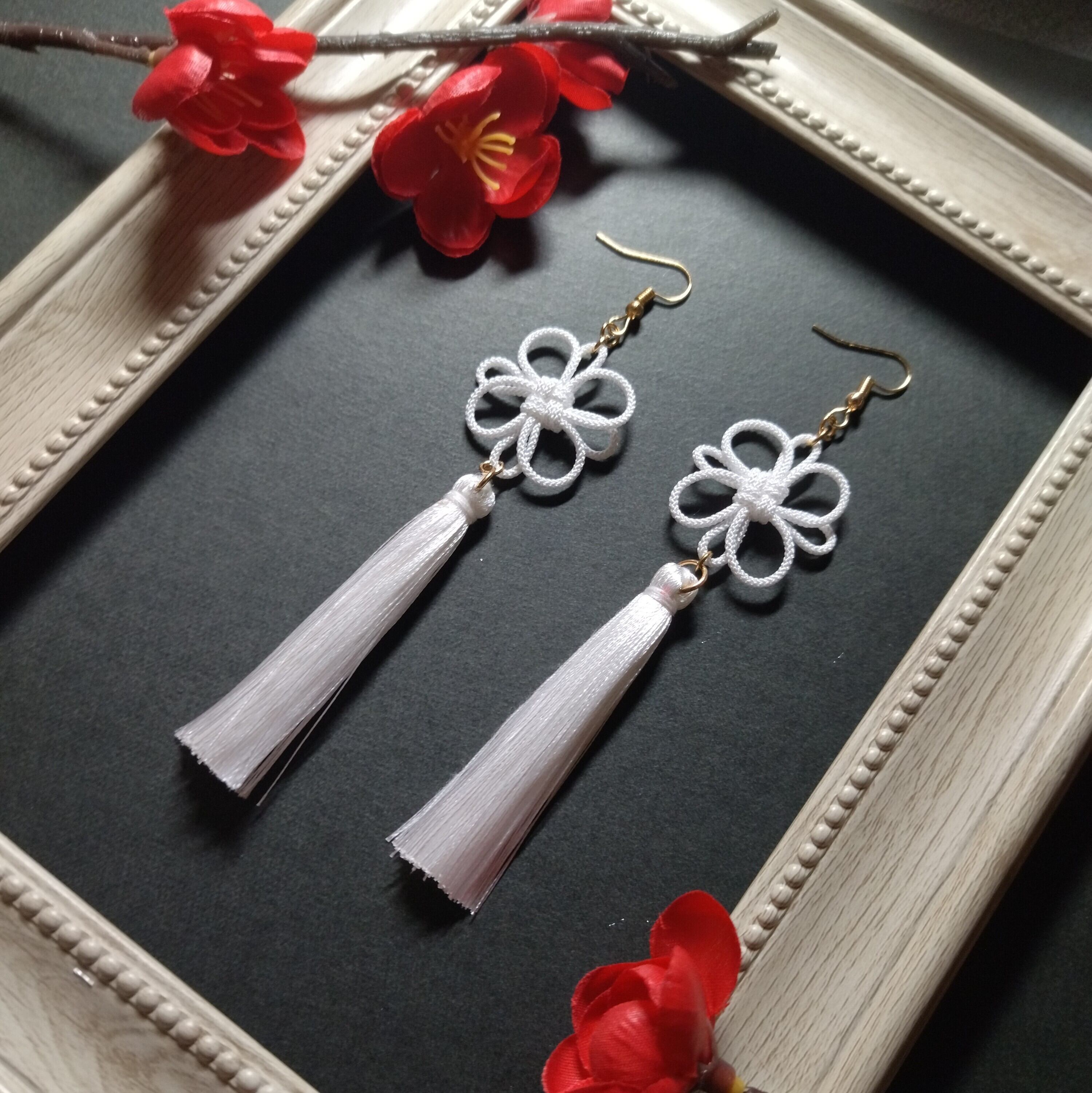 アジアンコード(1mm)で作った吉祥結びとタッセルを組み合わせたピアスです。