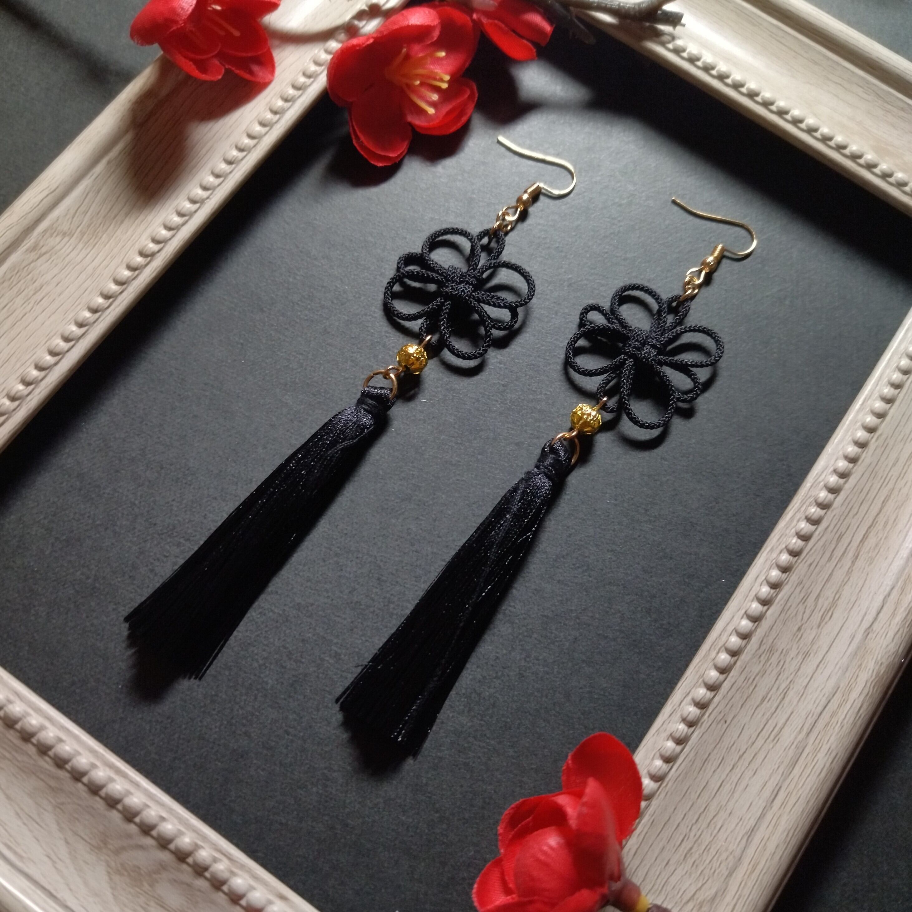 アジアンコード(1mm)で作った吉祥結びとタッセルを組み合わせたピアスです。飾り結びのピアスといえばこの形を思い浮かべる方も多いのではないでしょうか?