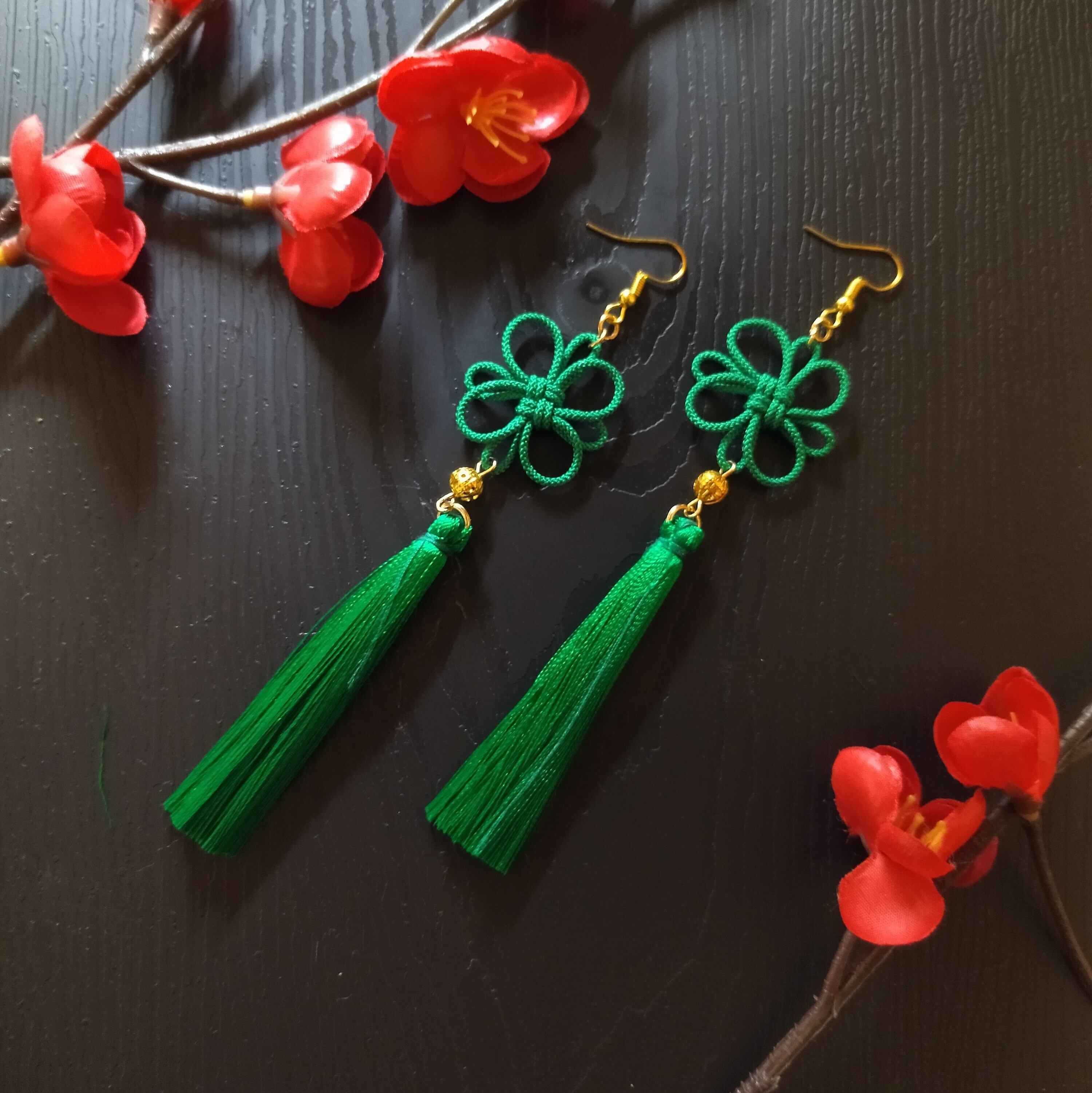 【和風】(ゴールドビーズ)吉祥結びとタッセルのピアス(イヤリング)(緑)【チャイナ】【中華風】【浴衣】【着物】【和ゴス】【袴】【成人式】【卒業式】