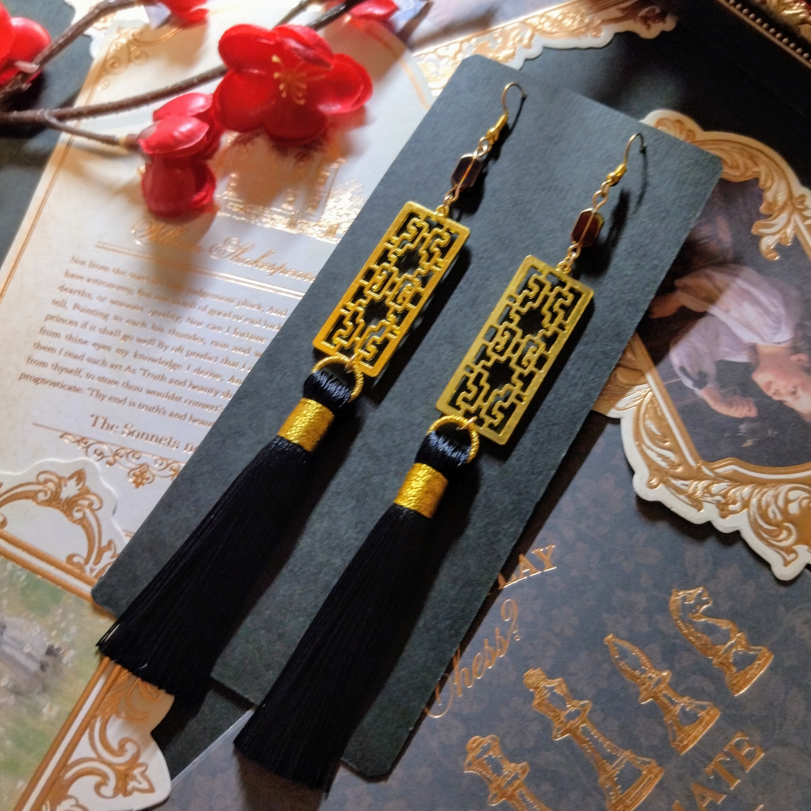 珍しい飾り窓のような中華風の透かしパーツとサラサラとした高級感のあるタッセルの組み合わせが大ぶりで主役級の存在感を醸し出します。