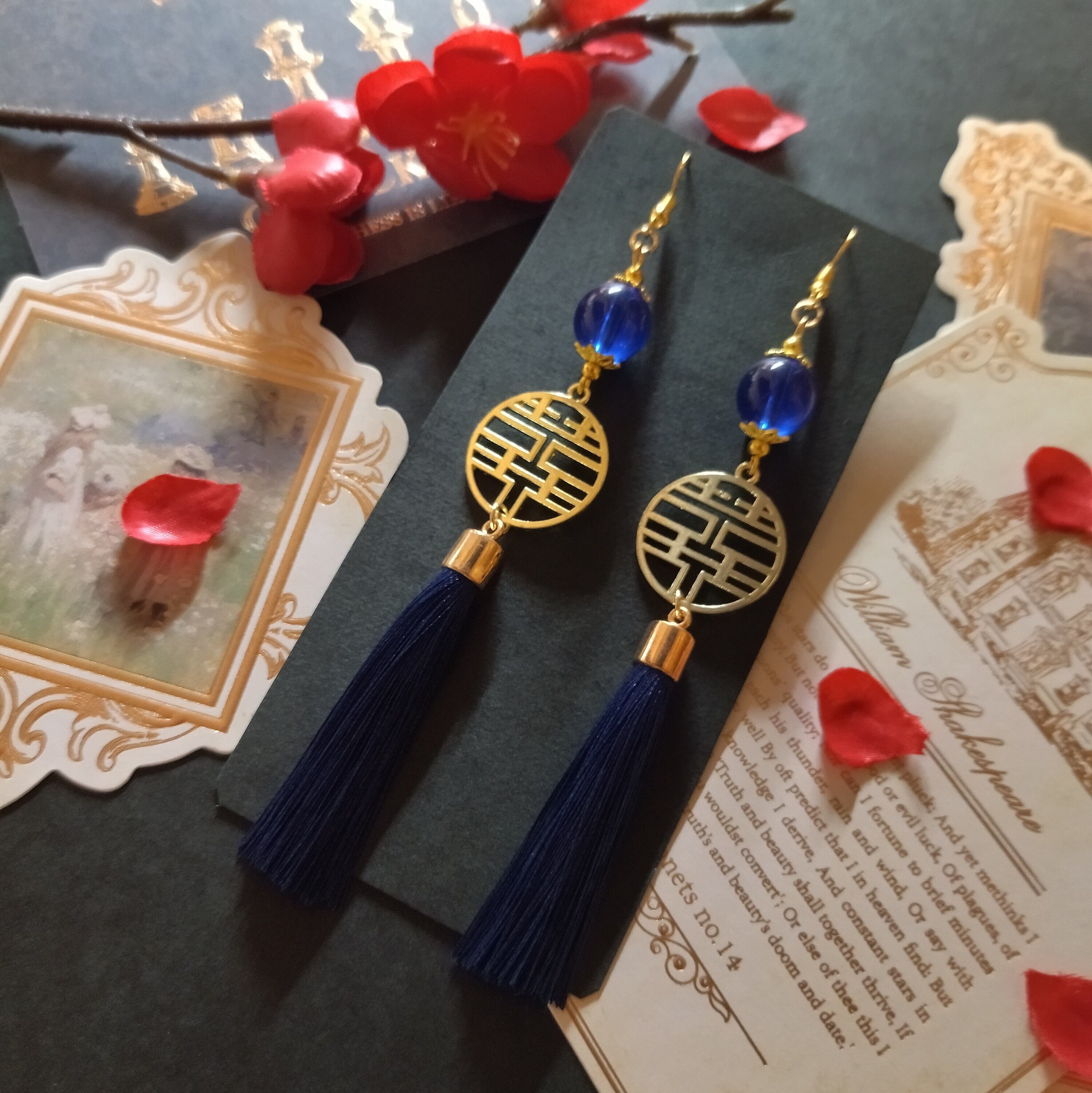 双喜紋とガラス玉のピアス(紺)(イヤリング)【中華風】【チャイナ】【ダブルハピネス】【華ロリ】