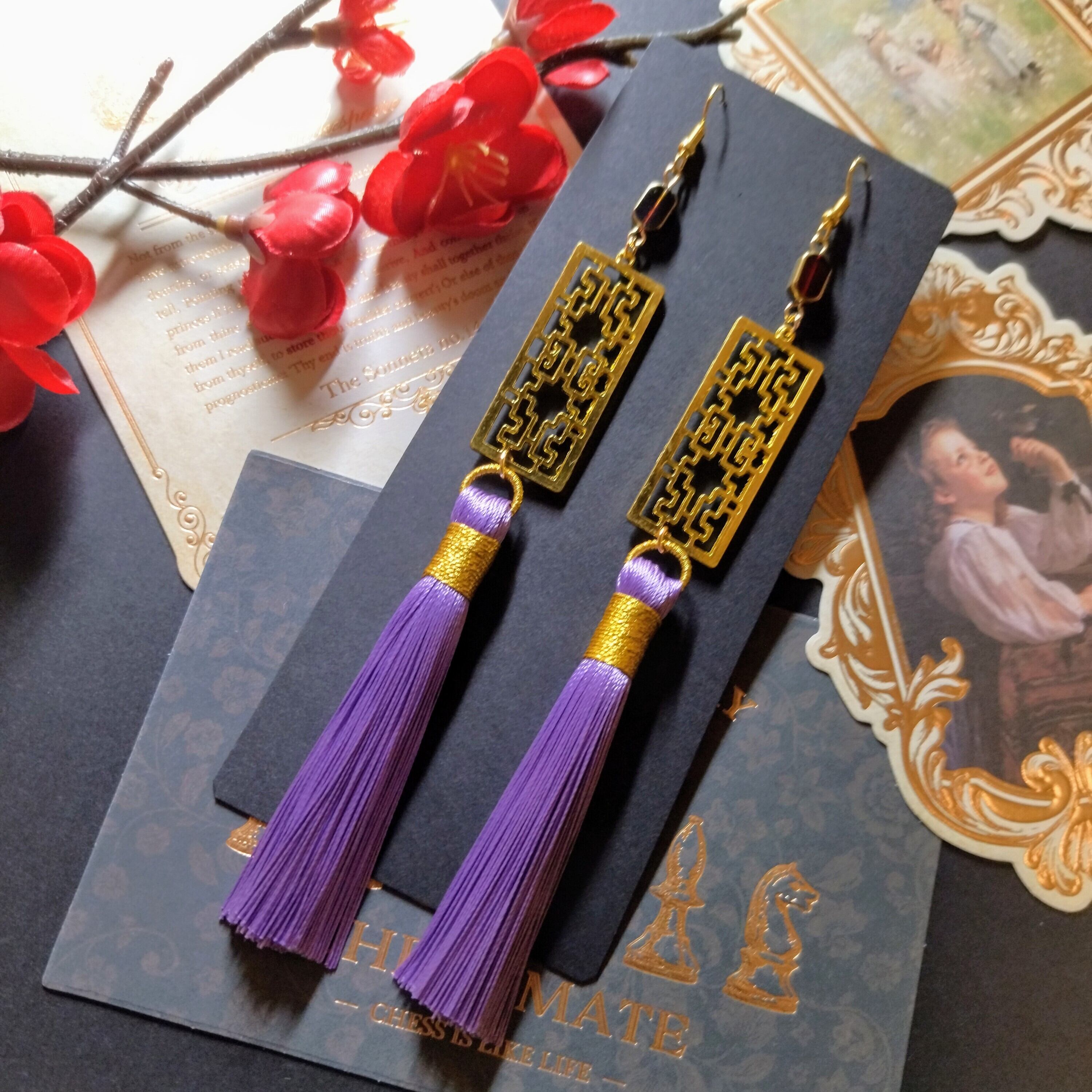 珍しい飾り窓のような中華風の透かしパーツとサラサラとした高級感のあるタッセルの組み合わせが大ぶりで主役級の存在感を醸し出します。